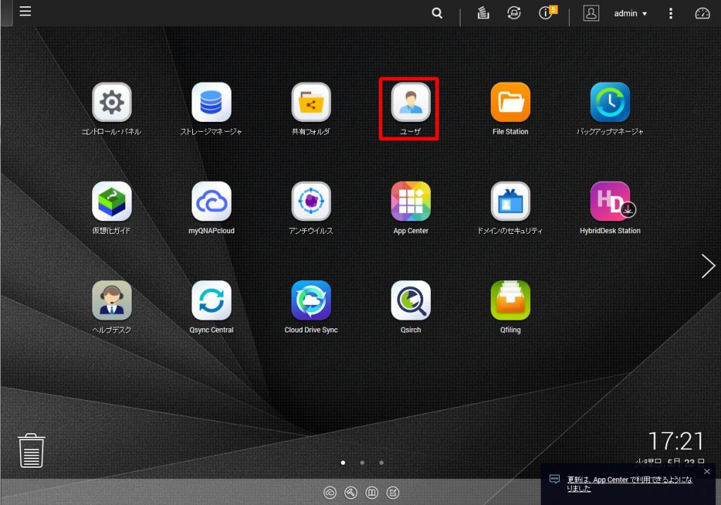 まずはユーザーを作成します。QNAPにログインし、ホーム画面のユーザーをクリックします。