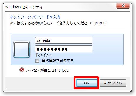 ユーザー認証を求められるので、同じように [yamada] ユーザーの情報を入力し、[OK] をクリックします。